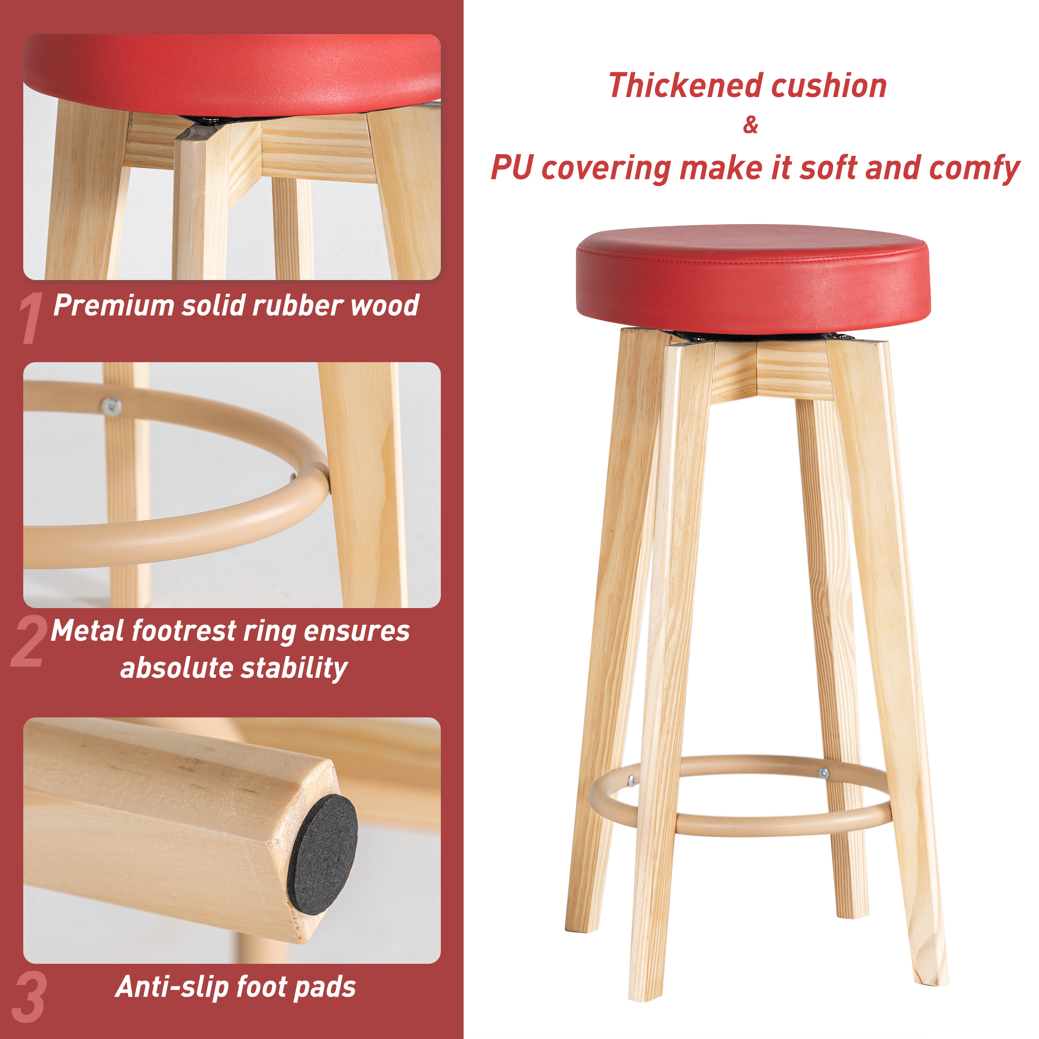 Sturdy Legs – The legs of our high stool is processed out of premium solid rubber wood that features excellent toughness and resistance to deformation, and a long service life. Four flared thickened legs provide strong support and ensure absolute stability, the EVA foamed nonslip foot pads, and the metal footrests further stabilize the whole construction. Designed with a load capacity of up to 300 lbs (135 kg).