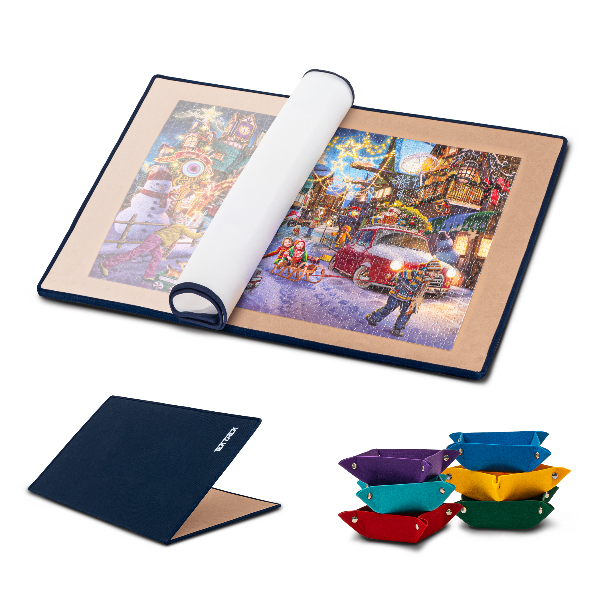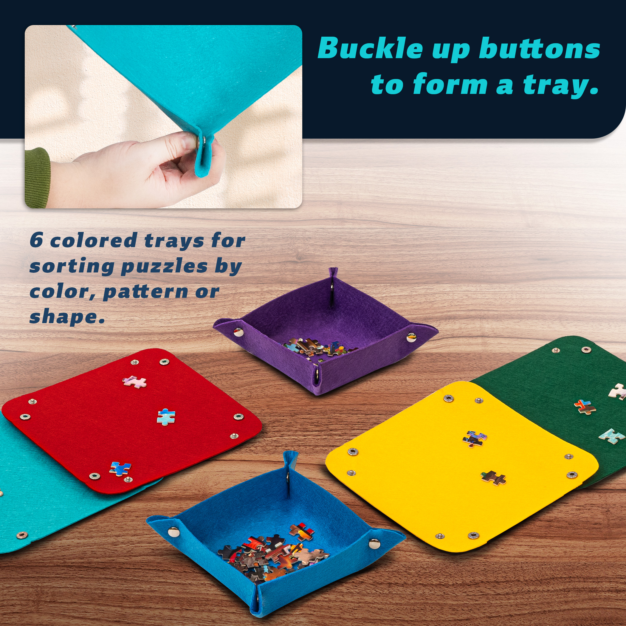 - 6 Colored Sorting Trays – Our puzzle board kit is equipped with 6 colored sorting trays, each measuring 9.8 × 9.8 in (25 × 25 cm). Before starting your puzzle fun, you can sort puzzle pieces by the color, pattern or shape.